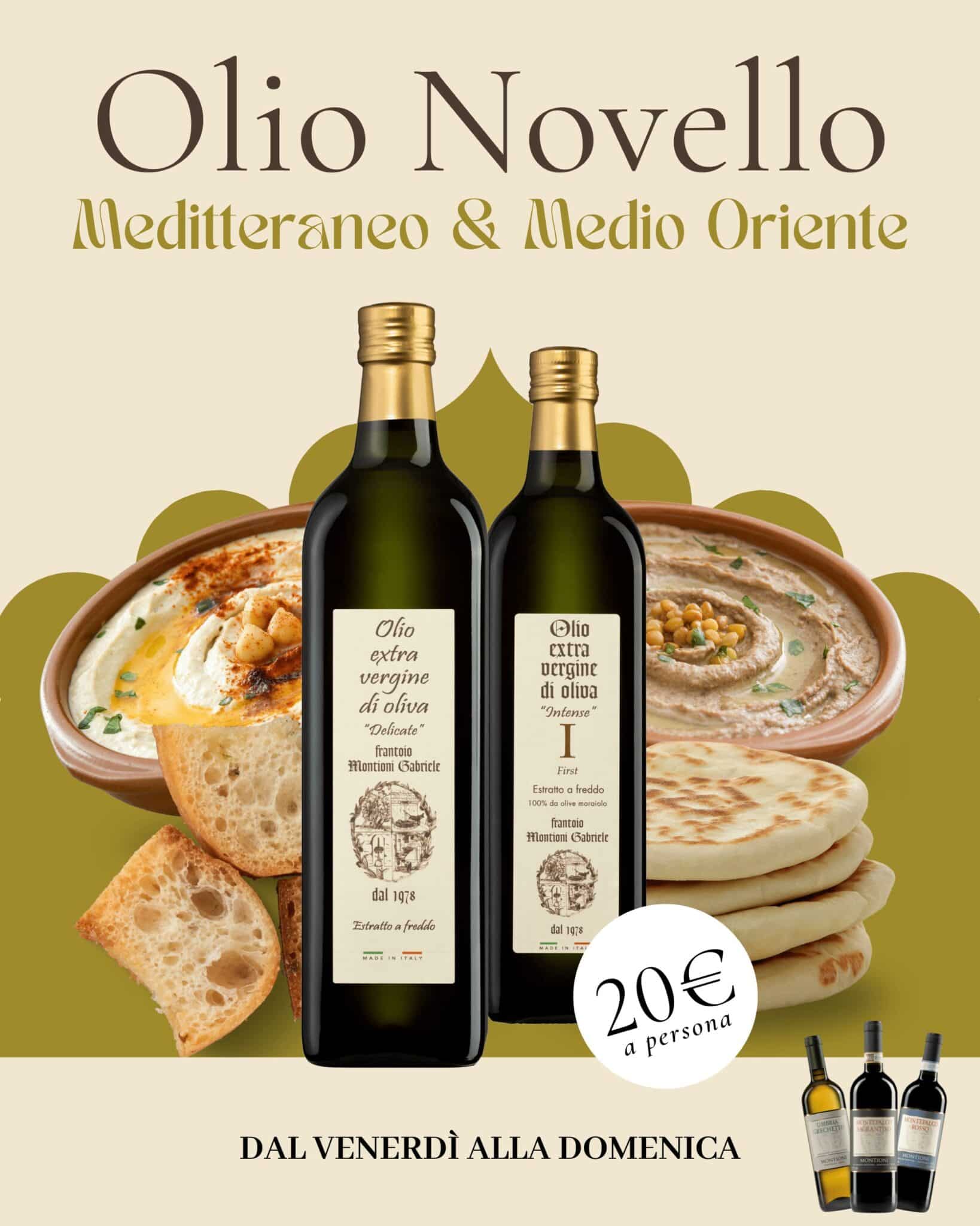 Degustazione dell’Olio Novello in abbinamento a 4 pietanze tipiche di aree geografiche con una forte cultura olivicola e a 3 vini tipici di Montefalco.