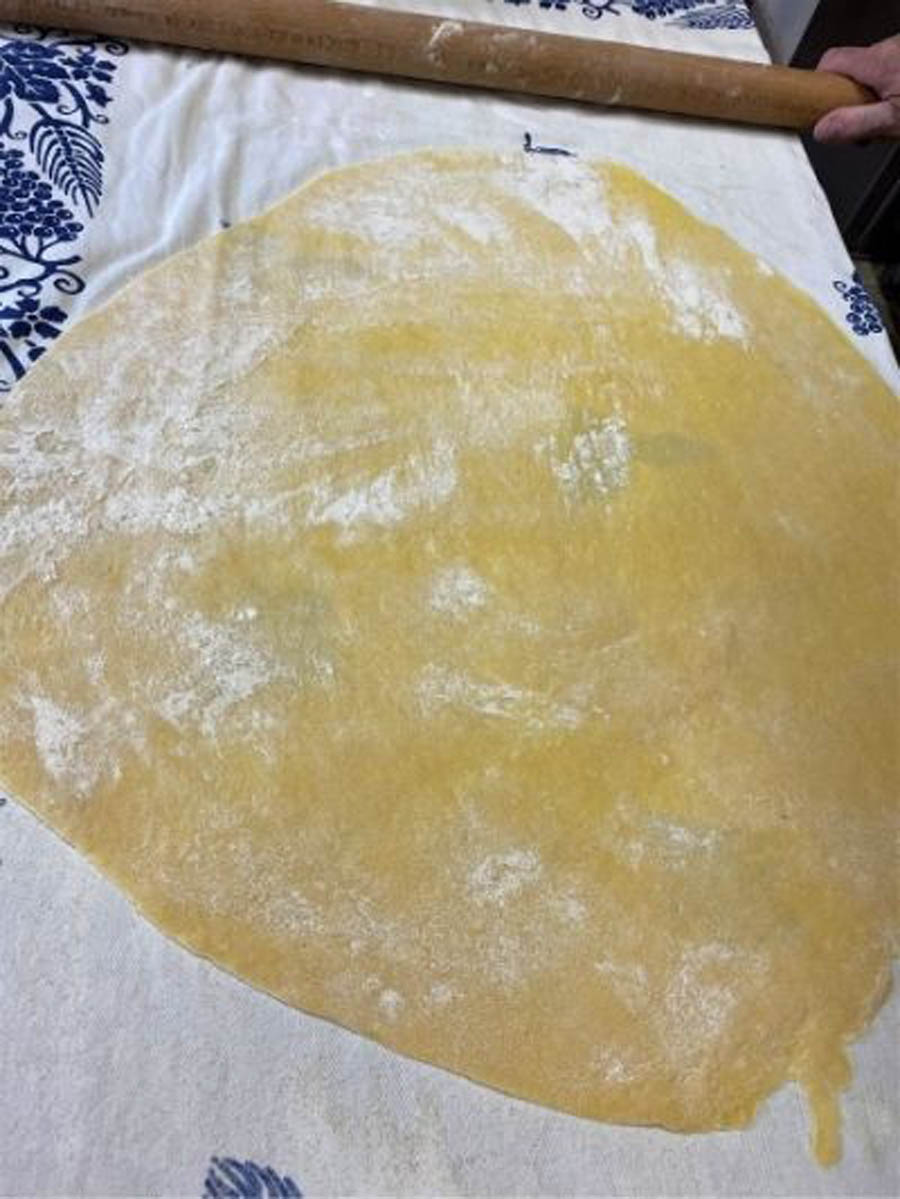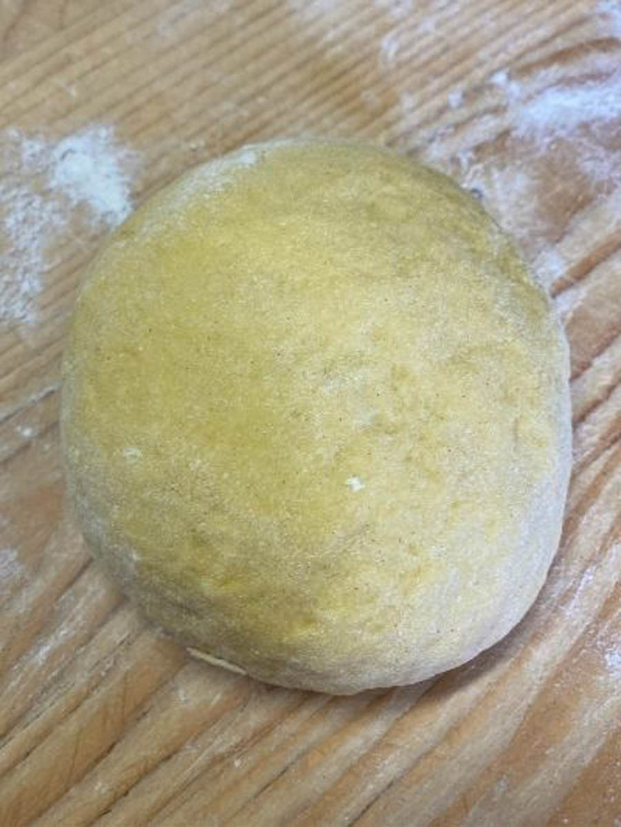 Con l’impasto ottenuto creare un panetto e su un tavolo da lavoro ripiegarlo più volte su sé stesso, con l’aiuto di un po’ di farina, fino ad ottenere una consistenza omogenea e morbida.