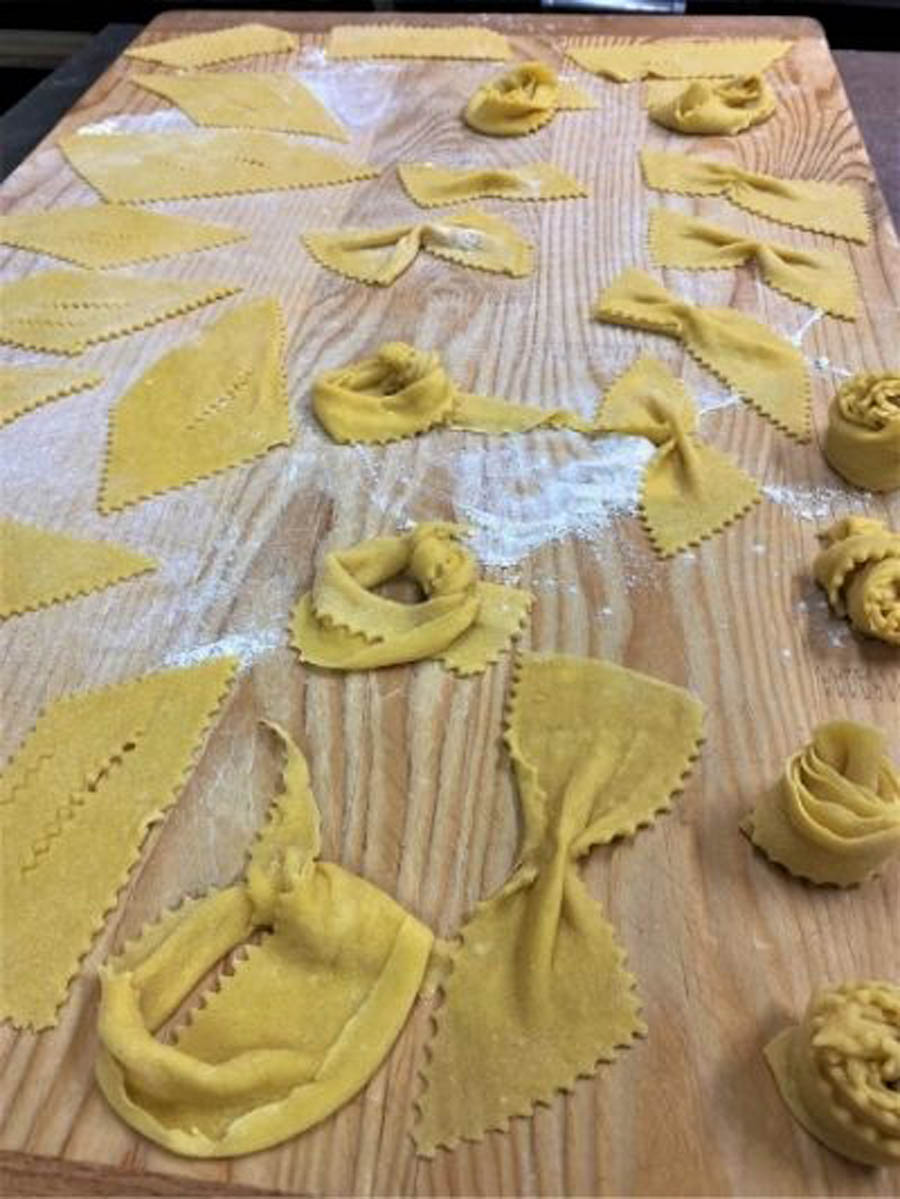 Una volta ripreso l’impasto, stendere una sfoglia sottile e tagliare delle strisce per creare le frappe realizzando delle forme a piacere (rombi, fiocchi, spirali, nodi…).