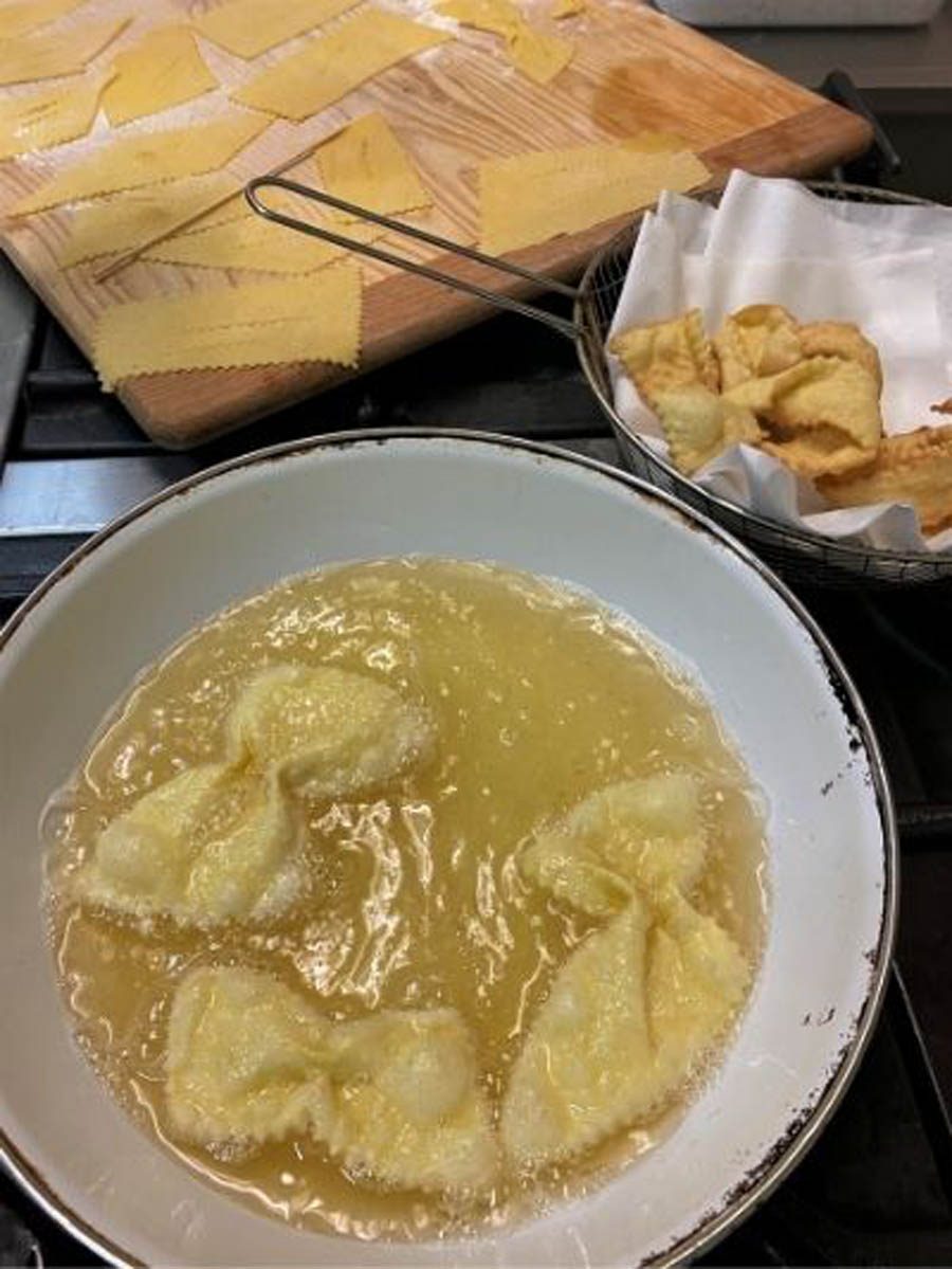 Quando l’olio è abbastanza caldo, si può iniziare a friggere immergendo le frappe, due o tre per volta, nell’olio per un paio di minuti.