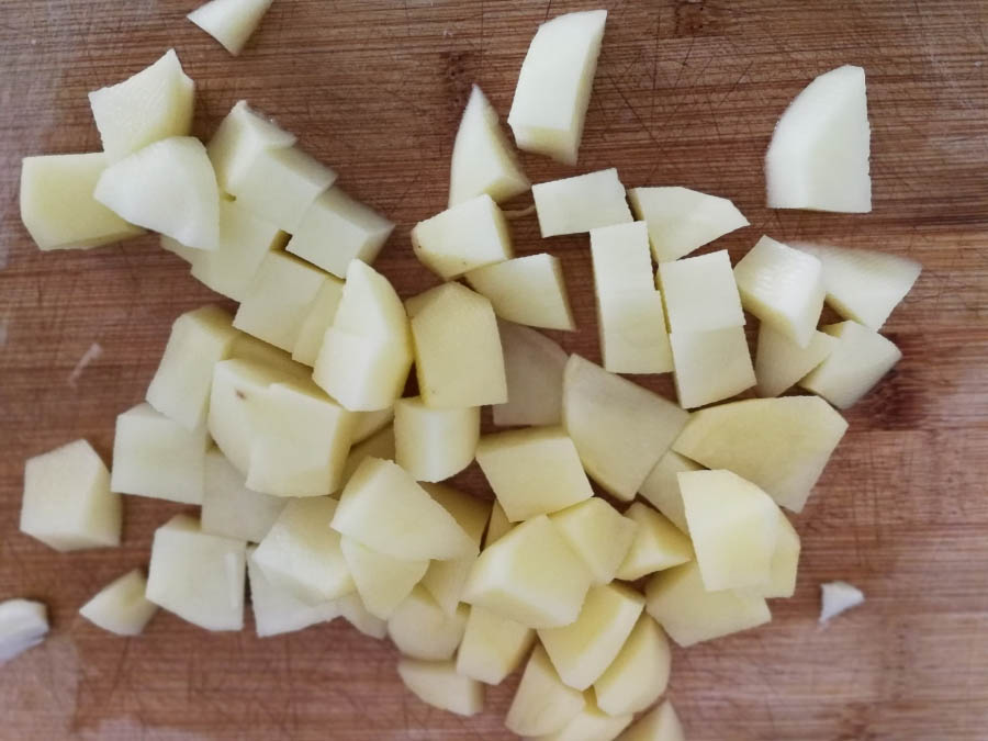 1) Pelate e tagliate le patate in cubetti della grandezza di 2/3 cm l’uno circa, mettetele a lessare in una pentola con acqua bollente per qualche minuto
