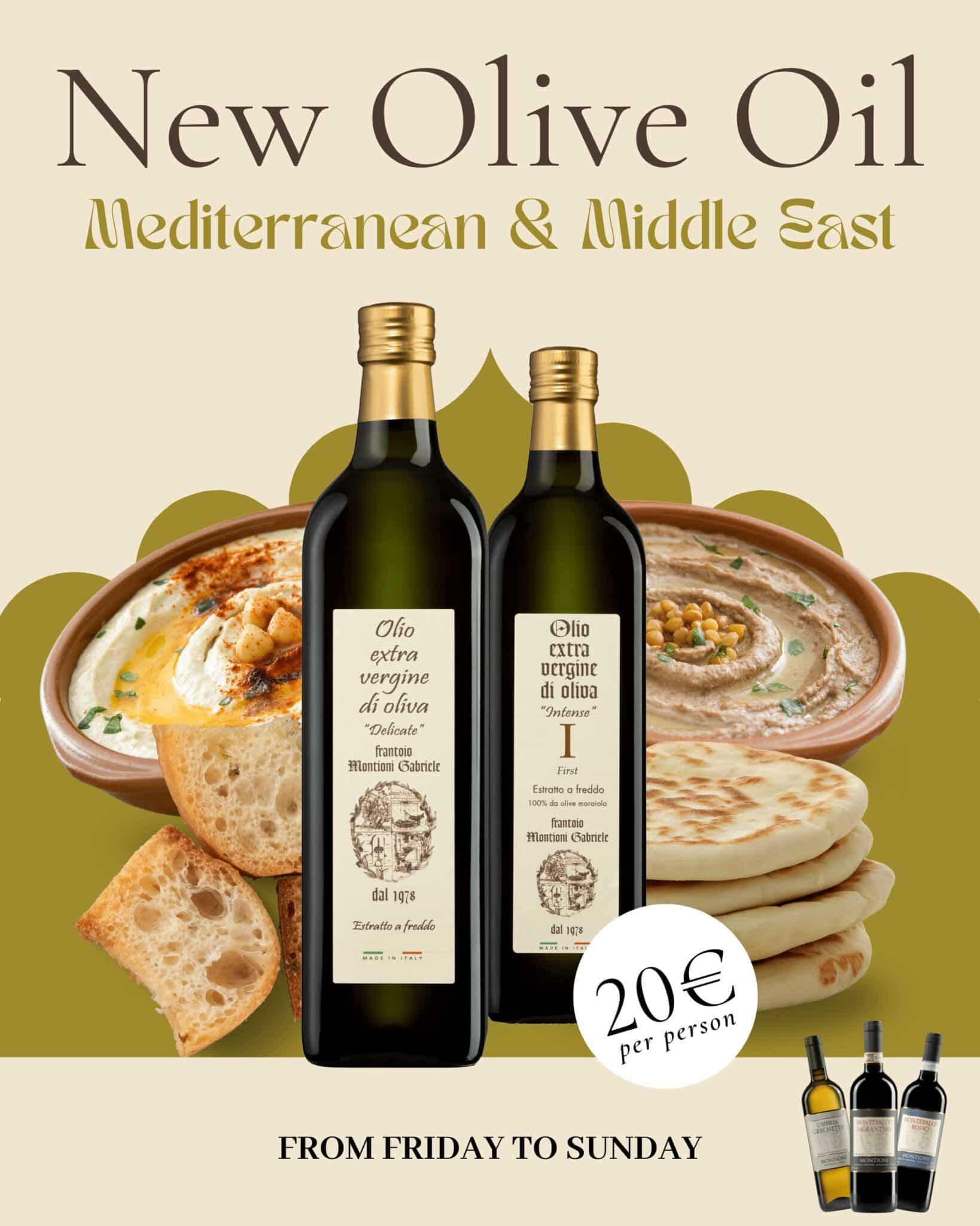 New Harvest Oil tasting paired with 4 traditional dishes from regions with a strong olive‑oil culture, accompanied by 3 typical wines from Montefalco.